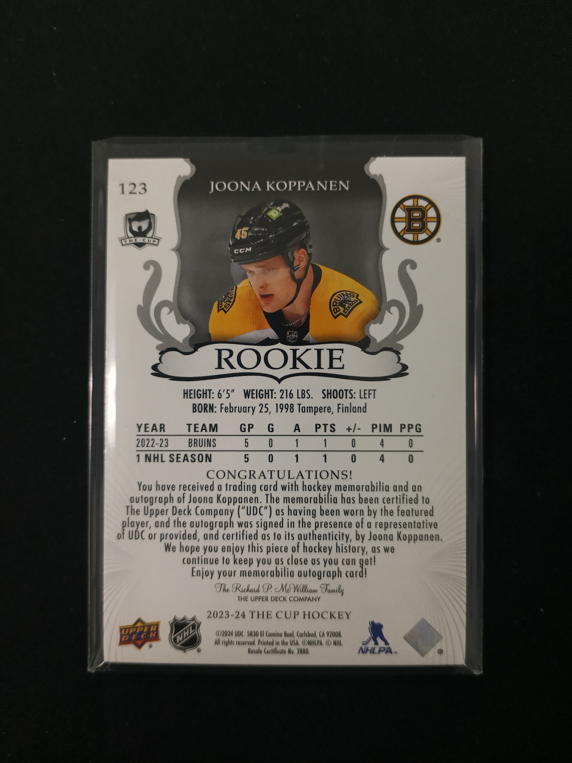 Joona Koppanen - Boston Bruins #123 Rookie Auto Patch RAP